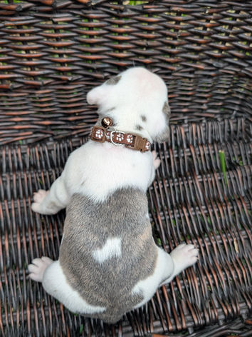 Introducing the lovely Rue, affectionately known as "Roo," a beautiful blue and white piebald female from our Bradie and Otis. She has been cherished in our home for her exceptionally sweet and gentle disposition. This tender-hearted girl is now ready to share a lifetime of gentle affection with her new family.